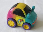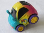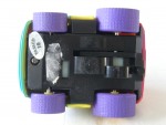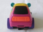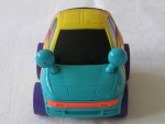 | Massstab | 1:38 |  schwarze, nicht durchsichtige Scheiben und angedeutete Targa-Dächer. Einfaches Kunststoffauto mit verzerrter Karosserie in fliessenden Farben. Pinke Frontstossstange und Heckblende. Übergrosse Rückspiegel in Wagenfarbe auf den Kotflügeln montiert, als Überrollbügel beim Überschlag. Auf den Seiten ein gelb-blau-roter Aufkleber, der die Funktion aufzeigt. Auf der Vorderachse gelbe 7-Steg-Felgen und auf der Hinterachse gelbe 5-Steg-Turbo-Felgen mit schwarzen Profilgummi-Reifen. Schwungrad-Antrieb mit Bügel in der Bodenplatte für die Überschlagfunktion. Kinderspielzeug