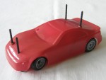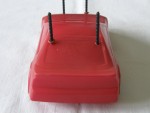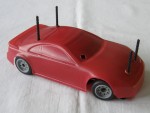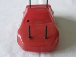 rot gespritzte Lexanhaube auf RC-Chassis, ohne Motor Handregler oder Servos, mit grauen 8-Doppelsteg-Felgen im BBS Design auf Gummi-Reifen. Distanzstege noch komplett vorhanden. Kann als R/C Fahrzeug ergänzt werden |