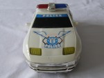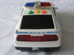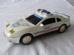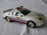 | Massstab | 1:17 |  schwarze, nicht durchsichtige Scheiben mit angedeuteten Targa-Dächer und Scheibenwischer. Chrom-Frontstossstange. Aufgesetzter Heckspoiler und Rückspiegel in Wagenfarbe an der A-Säule angebracht. Auf der Motorhaube und den Seiten weiss-blau-schwarze, geflügelte Aufkleber mit dem Aufdruck "Police" als Einsatzfahrzeug. Auf der Frontscheibe den blau-weissen Aufkleber "Police". Auf dem Dach eine rot-blaue Lichtbar und grün-gelb-rote Druckknöpfe für die Funktionen. Auf den Seiten zusätzlich ein blau-roter Streifenaufkleber. Auf dem Heckspoiler den weiss-blauen Aufkleber mit dem Aufdruck "Turbo". Kolorierte Lichter. Batteriebetriebenes Auto mit Anstossmotor. Chrom-5-Steg-Felgen mit Hartplastikräder. Einfaches Kinderspielzeug aus Kunsstoff mit Gebrauchsspuren aber komplett. Funktion nicht überprüft