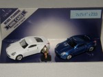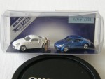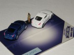 schwarze, nicht durchsichtige Scheiben. Kolorierte Lichter. Silber-schwarze Räder aber ohne bewegliche Teile. Aufgesetzte Seitenspiegel in Wagenfarbe an der A-Säule. Sehr detaliert für die kleine Grösse, als Metallauto. Mini-Diorama zusammen mit weissem Z und Damen-Figur |