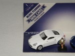 schwarze, nicht durchsichtige Scheiben. Kolorierte Lichter. Silber-schwarze Räder aber ohne bewegliche Teile. Aufgesetzte Seitenspiegel in Wagenfarbe an der A-Säule. Sehr detaliert für die kleine Grösse, als Metallauto. Mini-Diorama zusammen mit blauem Z und Damen-Figur |