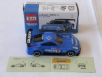 durchsichtige Scheiben, schwarzes Rechtslenker-Renn-Interieur, Schweller, Front- und aufgesetzter Heckspoiler mit dem weissen Aufdruck "Calsonic". Einem verbreiterten Rennfahrzeug der Japanischen Tourenwagen-Super-GT Meisterschaft des Calsonic Teams nachempfunden mit diversen Werbeaufdrucken und der rot-weiss-schwarzen Startnummer 12. Keine beweglichen Teile. Chromscheinwerfer und kolorierte Rückleuchten. Schwarze 5-Steg-Felgen mit Chrom-Zierring und Hartplastikräder. 2004-er Breit Serie als Team Fan Artikel zur Rennserie