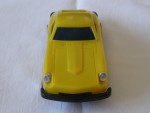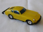 dunkelblaue, nicht durchsichtige Scheiben und verchromte Scheinwerfer. Schwarze Stossstangen die durch Anstoss nach hinten bzw. vorne geschoben werden um die Fahrrichtung zu verändern auch mit den lenkbaren Vorderräder. Chrom-Scheibenräder mit Gummi-Reifen. Einfaches Kunststoffauto |