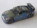 blau-schwarzes Interieur, Audioanlage im Kofferraum, blaue Streifen auf den Seiten und Kerzenkopf mit dem Aufdruck "Denso". Grosser, schwarzer Heckspoiler mit Aufdruck in weiss "RO_JA". Chromfelgen mit hellblauer 5-Steginnenseite und Gummireifen. Driftfahrzeug |