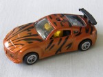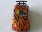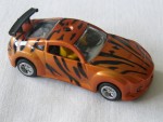 gelb-schwarzes Interieur, schwarze Airbrushmalereien über das ganze Auto und mit grossem schwarzem Heckspoiler. Chromfelgen mit Sternmuster und Gummireifen