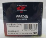 Durchsichtige Scheiben, schwarzes Rechtslenker-Renn-Interieur mit Überrollkäfig, aufgesetztem Heckspoiler mit weissem Aufdruck "Nissan", Schweller, Kühlergrill, Scheibenwischer und Rückspiegel an der A-Säule angebracht. Spoilerlippe vorne und hinten in Wagenfarbe. Ohne Heckscheibe. 2-Farben-Karosserie. Auf der Frontscheibe den weissen Sonnenschutz mit rot-schwarzem Aufdruck "Super GT". Silberne Türgriffe und Funkantenne auf dem Dach. Dem 2005-er Champion-Rennfahrzeug der Japanischen Super GT 500 Meisterschaft, des Xanavi Teams nachempfunden, mit diversen Werbeaufdrucken und der weiss-rot-schwarzen Startnummer 1.