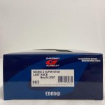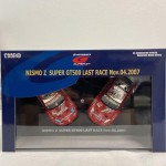 Fahrzeug 1 von 2. Durchsichtige Scheiben, schwarzes Rechtslenker-Renn-Interieur mit Überrollkäfig, aufgesetztem Heckspoiler mit weissem Aufdruck "Nissan", Schweller, Spoilerlippen vorne und hinten, Kühlergrill, Scheibenwischer und Rückspiegel an der A-Säule angebracht. Spoilerlippen hinter den Vorderrädern in Wagenfarbe und Auspuffrohre. Verchromtes Dach und Lufthutze auf dem Dach. Ohne Heckscheibe. 2-Farben-Karosserie. Auf der Frontscheibe den rot-weissen Sonnenschutz mit weiss-schwarz-rotem Aufdruck "Nismo Nissan Super GT". Silberne Türgriffe und Funkantenne auf dem Dach. Dem 2007-er Super GT 500 Rennfahrzeug des Motul Autech Teams nachempfunden, mit diversen Werbeaufdrucken und der weiss-rot-schwarzen Startnummer 22, in der Konfiguration für das letzte Saison-Rennen vom 04.11.2007. Blaue Glasscheinwerfer und koloriert Rücklichter. Schwarze 6-Steg-Felgen mit Renngummi-Reifen. Fahrzeug 1 aus dem offiziellen Autobacs GT Association Modellauto Set, zusammen mit dem Fahrzeug 2, dieses Rennens als Sammler Ausgabe, separat aufgelistet aber untrennbar auf Display-Sockel