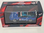 durchsichtige Scheiben, schwarzes Rechtslenker-Renn-Interieur mit Überrollkäfig, aufgesetztem Heckspoiler mit weissem Aufdruck "Calsonic", Schweller, Spoilerlippen vorne und hinten, Spoilerlippe hinter den Vorderrädern, Kühlergrill, Scheibenwischer und Rückspiegel an der A-Säule angebracht. Auspuffrohre hinter den Vorderrädern. Bläulich verchromtes Dach und Lufthutze auf dem Dach. Ohne Heckscheibe. Motorhaube mit unterschiedlichen Kühlöffnungen. Auf der Frontscheibe den gelb-weissen Sonnenschutz mit blau-schwarz-rotem Aufdruck "Calsonic Super GT". Silberne Türgriffe und Funkantenne auf dem Dach. Dem 2007-er Super GT 500 Rennfahrzeug des Calsonic Teams nachempfunden, mit diversen Werbeaufdrucken und der weiss-rot-schwarzen Startnummer 12. Glasscheinwerfer und kolorierte Rücklichter. Silberne 8-Doppel-Steg-Felgen mit Renngummi-Reifen. Fahrzeug aus der offiziellen Autobacs GT Association Modellauto Serie als Werkauftrag von Nismo, mit deren Artikel-Nummer 93915 REM 14-22 hier gezeigt mit Ebbro-Box