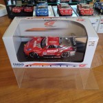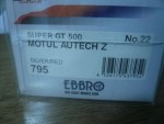 durchsichtige Scheiben, schwarzes Rechtslenker-Renn-Interieur mit Überrollkäfig, aufgesetztem Heckspoiler mit weissem Aufdruck "Nissan", Schweller, Kühlergrill, Spoilerlippen vorne und hinten und Scheibenwischer. Spoilerlippen hinter den Vorderrädern und Rückspiegel an der A-Säule angebracht in Wagenfarbe. Rote Lufthutze auf dem Dach. Ohne Heckscheibe. 2-Farben-Karosserie. Auf der Frontscheibe den rot-weissen Sonnenschutz mit weiss-schwarz-rotem Aufdruck "Nismo Nissan Super GT". Silberne Türgriffe und Funkantenne auf dem Dach. Dem 2006-er Super GT 500 Rennfahrzeugs des Motul Autech Teams nachempfunden, mit diversen Werbeaufdrucken und der weiss-rot-schwarzen Startnummer 22. Blaue Glasscheinwerfer und koloriert Rücklichter. Schwarze 6-Steg-Felgen mit Renngummi-Reifen. Fahrzeug aus der offiziellen Autobacs GT Association Modellauto Serie