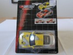 durchsichtige Scheiben, schwarzes Linkslenker-Interieur, Scheibenrahmen, B-Säule, angedeutete Kühlöffnungen auf der Motorhaube und Kühlergrill. 2-Farben-Karosserie. Schwarze, verschraubte und detaillierte Kunststoff-Bodenplatte. Zu öffnende Türen. Silberne Türgriffe und Domstrebe. Rückspiegel in Wagenfarbe an der A-Säule angebracht. Auf der Motorhaube und den Seiten ein gelb-weisser Aufdruck "Nissan" und die weiss-schwarze Startnummer 23. Auf der Frontscheibe und der Heckstossstange den roten Aufdruck "Nissan". Einem Rennfahrzeug der Japanischen GT-Meisterschaft nachempfunden. Glasscheinwerfer und kolorierte Rücklichter. Schwarze 5-Steg-Felgen mit Profilgummi-Reifen und Pull-Back-Antrieb. Fahrzeug aus einem 4-er Set Die Cast Action Cars Racing