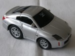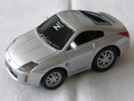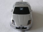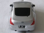 schwarze, nicht durchsichtige Scheiben, mit weissem Aufdruck "Fairlady Z" auf der Frontscheibe. Kolorierte Lichter und verzerrte Karosserie. Silberne 5-Doppelsteg-LM-Felgen in BBS Design. Kunststoffmodell mit Pull-Back-Motor |
