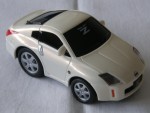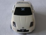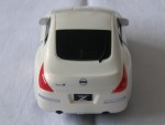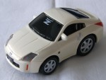 schwarze, nicht durchsichtige Scheiben, mit weissem Aufdruck "Fairlady Z" auf der Frontscheibe. Kolorierte Lichter und verzerrte Karosserie. Silberne 6-Steg-LM-Felgen. Kunststoffmodell mit Pull-Back-Motor
