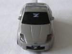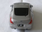 schwarze, nicht durchsichtige Scheiben, mit weissem Aufdruck "Fairlady Z" auf der Frontscheibe. Kolorierte Lichter und verzerrte Karosserie. Silberne 6-Steg-LM-Felgen. Kunststoffmodell mit Pull-Back-Motor |