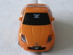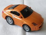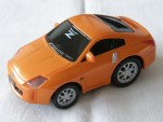 schwarze, nicht durchsichtige Scheiben, mit weissem Aufdruck "Fairlady Z" auf der Frontscheibe. Kolorierte Lichter und verzerrte Karosserie. Silberne 5-Doppelsteg-LM-Felgen in BBS Design. Kunststoffmodell mit Pull-Back-Motor