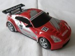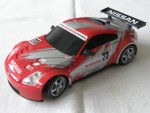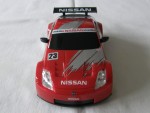 schwarze, nicht durchsichtige Scheiben, nach einem Fahrzeug der GT500 Rennserie nachempfunden mit grossem Heckspoiler und diversen Werbeaufklebern und der Start-Nr. 23. Kolorierte Lichter und silberne 5-Steg-Felgen mit Gummireifen und lenkbaren Vorderrädern. Funkfernsteuerauto in 27 MHz Konfiguration |