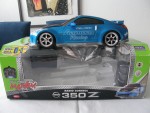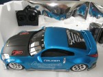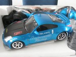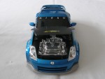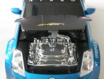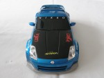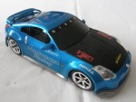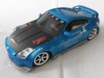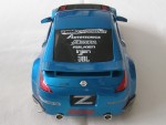 schwarze, nicht durchsichtige Scheiben, zu öffnede Motorhaube mit Motorapplikationen, in der NISMO-S-Tune Strassenvariante mit diversen Werbeaufklebern. Funkfernsteuer Auto in der 40 KHz Konfiguration. Kolorierte Lichter und Chrom-5-Steg-Felgen mit Profil-Gummireifen und lenkbaren Vorderrädern |
