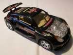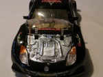 cremefarbiges Interieur und durchsichtige, zu öffnende Motorhaube mit Motorapplikation in Chrom in der Nismo-Tune Variante. Mit grossen Spoilern als Linkslenker. Funkfernsteuerauto mit kolorierten Lichtern und lenkbaren Chrom-5-Steg-Felgen mit Gummiprofilreifen |