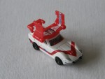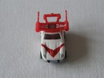 durchsichtige Scheiben, rotes Interieur, klappbare Flügel auf dem Dach und Düsenantrieb auf der Heckklappe. In der Front zwei Dornen und silberne Scheinwerferabedeckungen. Mach Baron Flight-Z Figur aus Japanischer Comic-NTV-Serie. Schwarze Hartplastikräder |