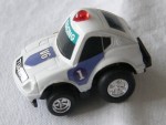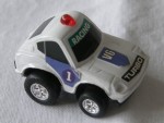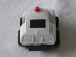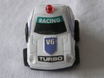schwarze nicht durchsichtige Scheiben, mit Aufklebern "Racing V6 Turbo Nr. 1" auf der Motorhaube, der Frontscheibe und den Seiten sowie einem roten Drhlicht auf dem Dach. Chrom-5-Steg-Felgen mit Gummi-Reifen un Pull-Back-Antrieb |