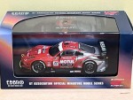Durchsichtige Scheiben, schwarzes Rechtslenker-Renn-Interieur mit Überrollkäfig, aufgesetztem Heckspoiler mit weissem Aufdruck "Nissan", Schweller, Kühlergrill, Scheibenwischer und Rückspiegel an der A-Säule angebracht. Spoilerlippe vorne und hinten in Wagenfarbe. Ohne Heckscheibe. 2-Farben-Karosserie. Auf der Frontscheibe den weissen Sonnenschutz mit rot-schwarzem Aufdruck "Super GT". Silberne Türgriffe und Funkantenne auf dem Dach. Dem 2005-er Rennfahrzeug der Japanischen Super GT 500 Meisterschaft, des Motul Value Teams nachempfunden, mit diversen Werbeaufdrucken und der weiss-rot-schwarzen Startnummer 22, in der Konfiguration für das Rennen in Malaysia. Glasscheinwerfer und koloriert Rücklichter. Schwarze 6-Steg-Felgen mit Renngummi-Reifen. Fahrzeug aus der offiziellen Autobacs GT Association Modellauto Serie