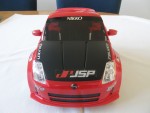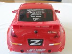 schwarze, nicht durchsichtige Scheiben und Motorhaube. Funkfernsteuermodell als Nismo-Tune-Variante für den Japanischen Markt mit verzerrter Karosserie. Aufdrucke "Falken, JSP, Monza und Niken" überall auf dem Auto. Silberne 6-Stegfelgen mit Gummiprofilreifen |
