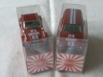 | Massstab | 1:60 |  Einzelanfertigung von "Filter" (Axel Böhm) vom Hot-Wheels-Forum. Herzlichen Dank für die zwei Schöhnheiten. Basis sind beides Regulars von Hot-Wheels und individuell aufgebaut als Recing Set. 1. Datsun Fairlady mit Hart-Top, mit diversen Werbeaufklebern, der Startnummer 7 und Red-Liner-Rädern und Chrom-10-Steg-Felgen. 2. Datsun 510 Bluebird als Werkstattwagen in gleichem Design. Beide in Individual-Boxen