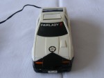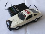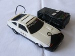 | Massstab | 1:35 |  schwarze, nicht durchsichtige Scheiben. Auf der Motorhaube ein gold-schwarzer Aufkleber der Polizei. Auf der Frontscheibe einen schwarz-weiss-roten Aufkleber mit dem Aufdruck "Fairlady Z". Einsatzfahrzeug der Japanischen Polizei mit roter, einklappbarer Lichtbar auf dem Dach und Hoheitszeichen auf der Motorhaube und den Seiten. Kolorierte Lichter. Batteriebetriebenes Kabelfernsteuermodel. Lenkbare, Chrom-Original-Felgen mit Gummi-Reifen, zum Teil plattgestanden und etwas vergilbt von Sonneneinstrahlung aber komplett
