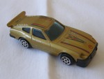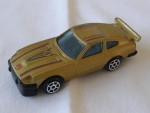 | Massstab | 1:45 |  bläuliche, durchsichtige Scheiben, ohne Interieur, Frontstossstange-Spoiler-Einheit, vernietete Bodenplatte und Stossstange-Heckleuchten-Einheit. Entlüftungsgitter auf der Motorhaube, Jalousie als Heckfenster und grosser Turbo-Heckspoiler in Wagenfarbe. Auf der Motorhaube und dem Dach rot-blaue Streifen, das rote "Shell"-Logo und die blau-rote Startnummer 8. Auf der Heckklappe den blauen Aufdruck "280 ZX". Chrom-6-Steg-Felgen, nicht durchbrochen, mit Gummi-Reifen und Pull-Back-Antrieb