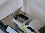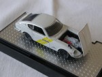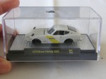 durchsichtige Scheiben, schwarzes Interieur, zu öffnende Motorhaube mit angedeutetem Motor und schwarzen Seitenspiegeln auf den Kotflügeln montiert. Kolorierte Lichter. Aufdruck in schwarz "Nissan" in gelbem Doppel-Streifen auf den Seiten. Schwarze Magnesium-Originalfelgen mit Gummi-Reifen. Limitierte Serie (6000 Weltweit) aus der Auto-Japan-Serie |