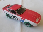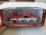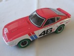 | Massstab | 1:24 |  dursichtige Scheiben, schwarzes Interieur samt Überrollbügel und Heckblende. aufgesetzter Heck- und Frontspoiler und Scheinwerferabdeckungen in Wagenfarbe. In silber gefärbte Scheibnrahmen und Frontstossstange, hinten nicht montiert. In gelb eingefärbte 2-flutige Auspuffanlage. Dem 1970-er SCCA-Strassenrennfahrzeug des John-Morton-BRE Teams, mit der Startnummer 46, nachempfunden, mit diversen Werbeaufdrucken. Kolorierte Rücklichter Grüne 4-Stegfelgen und Profilgummi-Reifen. Fahrzeug aus der limitierten Tokyo Torque Serie als Green Machine
