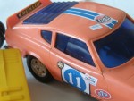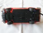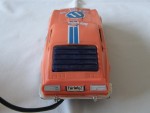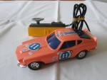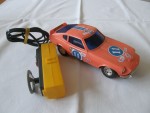 blaue, nicht durchsichtige Scheiben. Chrom-Stossstangen und Lichter, mit Kabelfernsteuerung und diversen Werbeaufklebern. Rechte Seitenscheibe mit Riss. Lenkbare Vorderräder mit Chrom-5-Steg-Felgen und Gummi-Reifen. Einfaches Kunstsoff Spielzeug |
