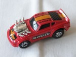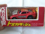 | Massstab | 1:59 |  schwarze, nicht durchsichtige Scheiben und Heckjalousie. Kotflügelverbreiterungen, aufgesetzter Heckspoiler, Scheinwerferabdeckungen und Stossstangen in Wagenfarbe. Auf dem ganzen Auto ein schwarz-oranger Streifen mit dem schwarzen Aufdruck "240ZG". Auf den Seiten den schwarz-weissen Aufdruck "240ZG". Aus der Motorhaube schaut ein verchromter V-6 Motor mit Kompressor und langen Auspuffrohren hervor. Chrom-6-Steg-Felgen mit Gummi-Reifen. Fahrzeug aus der Tomica-Dash Serie von 1977