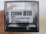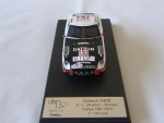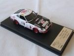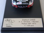 | Massstab | 1:43 |  durchsichtige Scheiben, schwarzes Rennintereieur, mit Reserverad im Kofferraum, Überrollbügel, Scheibenwischer, Motorhaube und Heckblende. Rote Rückspiegel bei der A-Säule montiert und Stossstangen mit 6 Zusatzscheinwerfern vorne. Auf der Motorhaube den weissen Aufdruck "Datsun" und "Ritz" sowie Werbeaufdrucke. Auf dem Dach rot-schwarz-gelbe Aufdrucke "Ritz Lisboa" sowie Werbeaufdrucke und Funkantenne. "Auf den Seiten ein roter Streifen und die schwarze Startnummer 18 plus diversen Werbeaufdrucken. Auf der Heckklappe diverse Werbeaufdrucke und den weiss-blauen Rally-Portugal-Aufdruck mit der Startnummer 18. Dem 1973-er Rally-Rennfahrzeug der Portugal-Rally, mit den Fahrern A.C. Oliveira/ Barata, mit der Startnummer 18, nachempfunden. Kolorierte Lichter. Rote 4-Doppel-Steg-Felgen mit Profilgummi-Reifen. Auf 120 Stück weltweit limitiertes Die-Cast-Fahrzeug einer Rennfahrzeug-Serie dieses Kleinserien-Modellauto Herstellers, montiert auf schwarzem Displaysockel mit Alu-Plakette