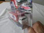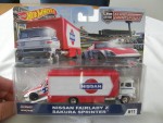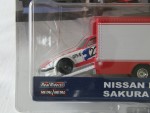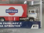 | Massstab | 1:60 |  durchsichtige Scheiben, schwarzes Interieur und Frontstossstange. Aufgesetzter Heckspoiler und Kotflügelverbreiterungen in Wagenfarbe. Auf der Motorhaube weisser Steifen mit der weiss-schwarzen Startnummer 23. Auf den Seiten ein roter Streifen, ein blauer, stilisierter Tiger mit der weiss-schwarzen Startnummer 23 und Werbeaufdruck in schwarz GTS-II. Kolorierte, runde 4-Augenrücklichter. Schwarze 5-Steg-Felgen mit Hartplastikräder. Fahrzeug Nr. 11 aus der Car-Culuture-Serie "Team-Transporter" mit SCCA-Rennwagen, wie beschrieben, zusammen mit einem Sakura Sprinter Renntransporter