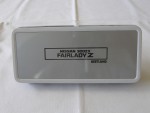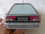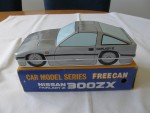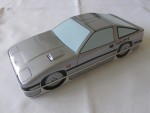 | Massstab | 1:24 |  Blechbehältnis das einem Nissan 300 ZX (erste Version) nachempfunden ist, als Stiftbox. Hellblaue, nicht durchsichtige Scheiben, mit angedeuteten Targa-Dächern. Auf den Seiten ein schwarzer Zierstreifen und die Aufschrift "Fairlady Z". Kolorierte Lichter. Angedeutete graue 5-Steg-Felgen/Räder. Im inneren ein herausnehmbares Zusatzabeil beschriftet in schwarz "Nissan Fairlady Z 300 ZX Beetland"