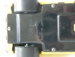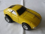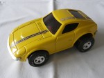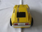 schwarze, nicht durchsichtige Scheiben. Blechauto mit verzerrter Karosserie. Chrom Stossstangen und Rückleuchten-Heckblende-Kombination. Über dem ganzen Auto schwarze Streifen. Koloriert Rückleuchten. Chrom-5-Steg-Felgen im Wolf-Race Desin und Hartplastikräder mit Schwungradantrieb. Diverse Gebrauchsspuren aber komplett |