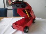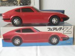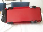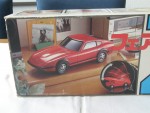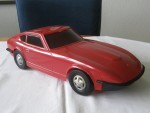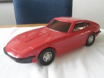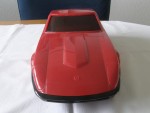 schwarze, nicht durchsichtige Scheiben und Stossstangen. Aufgesetzte Kotflügelverbreiterungen in Wagenfarbe. Dem rechtslenker Strassenfahrzeug für Japan nachempfunden. Karosserie kann individuell bemalt werden und angehoben, um Tomica Modellautos aufzubewahren. Silberne Originalraddeckel und Hartplastikräder. Kinderspielzeug