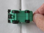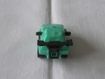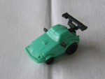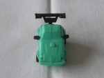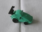 zwei Kunststoff-Hälften zusammengeklebt und festgehalten mit einem schwarzen, grossen Heckspoiler. Auf den Seiten, auf der Höhe der A-Säule zwei ebenfalls schwarze Rückspiegel. Schwarze Hartplastikräder im 12-Steg-Designe ohne Antrieb. Im Heck eine quadratische Öffnung um eine unbekannte Aktion auszulösen |