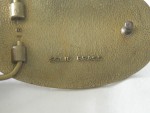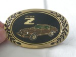 Gürtelschnalle oval aus massiver Bronze die emailiert und farbig einen Datsun 280 ZX der ersten Serie in braun auf schwarzem Grund darstellt. Oben links ist in weiss ein "Datsun-Z" aufgedruckt. Kann mit speziellem Gürtel mit Klickhalterungen getragen werden |