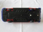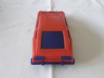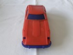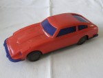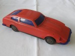 blaue, nicht durchsichtige Scheiben, Lichter und Stossstangen. Rückspiegel auf den Kotflügeln (fehlen). Schwarze, verschraubte Bodenplatte. Entlüftungsgitter auf der Motorhaube in Wagenfarbe. Graue Raddeckel im Strahlendesign und Gummi-Reifen mit Schwungrad-Antrieb. Einfaches Kunststoff Kinderspielzeug in bespieltem Zustand |
