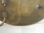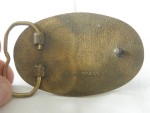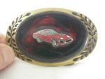Gürtelschnalle oval aus massiver Bronze die emailiert und farbig einen Nissan 300 ZX in rot auf schwarzem Grund darstellt, mit rotem Heliogramm. In den Rundungen sind schwarze Blattverzierungen eingelassen. Kann mit speziellem Gürtel mit Klickhalterungen getragen werden |