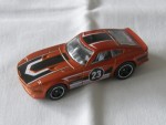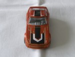 durchsichtige Scheiben, graues Linkslenker-Interieur. Schwarze, vernietete Kunststoffbodenplatte. Auf der Motorhaube und dem Dach schwarz-weisse Streifen. Auf den Seiten schwarz-weisse Streifen und die schwarz-weisse Startnummer 23, das Hot Wheels Logo und Werbeaufdruck. Schwarze 5-Steg-Felgen mit Chromzierring und Hartplastikräder. Fahrzeug aus der 2026-er Then and Now Serie, zweite Farbvariante