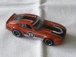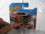 durchsichtige Scheiben, graues Linkslenker-Interieur. Schwarze, vernietete Kunststoffbodenplatte. Auf der Motorhaube und dem Dach schwarz-weisse Streifen. Auf den Seiten schwarz-weisse Streifen und die schwarz-weisse Startnummer 23, das Hot Wheels Logo und Werbeaufdruck. Schwarze 5-Steg-Felgen mit Chromzierring und Hartplastikräder. Fahrzeug aus der 2026-er Then and Now Serie, zweite Farbvariante