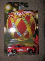durchsichtige Scheiben, schwarzes Interieur. Auf dem ganzen Auto ein grün-weisser Streifen mit der grün-weiss-goldenen Startnummer 25. Gold-Chrom-5-Steg-Felgen mit Hartplastikräder. Fahrzeug aus der 2011 K-Mart Exclusiv-Serie "Holiday Hot Rods" |