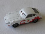 | Massstab | 1:60 |  weiss-schwarze, nicht durchsichtige Scheiben, schwarzer Kühlergrill sowie silberner Heckstossstange. Rückspiegel in Wagenfarbe auf den Kotflügeln montiert. Die Frontscheibe mit grimmigen Augen. Auf den Seiten rotes Flammenmuster als 240 Z "Mach Matsuo" des Walt-Disney-Pixar Trickfilms "Car". Kolorierte Lichter. Dunkelgraue-5-Steg-Felgen mit Hartplastikräder
