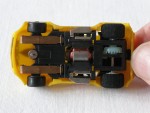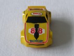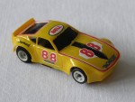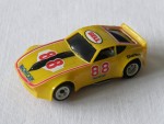 Durchsichtige Scheiben, ohne Interieur und Karosserie, die an einen verbreiterten Datsun 240 Z, als Rennfahrzeug erinnert für die H-0 Slot-Rennbahn. Auf der Karosserie sind Aufdrucke "Monroe und Bell", diverse Werbeaufdrucke sowie die Startnummer 88, vorhanden. Weisse 5-Steg-Felgen mit Weichgummi-Reifen |