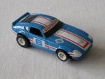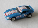 | Massstab | 1:60 |  schwarze, nicht durchsichtige Scheiben, ohne Interieur. Karosserie, die an einen verbreiterten Datsun 240 Z als Rennfahrzeug erinnert, für die H-0 Slot-Rennbahn. Über dem ganzen Auto und den Seiten weiss-rote Streifen mit der blau-weissen Startnummer 6 auf den Seiten und der Motorhaube sowie auf der Frontscheibe einen rot-weissen Aufkleber "Datsun". Weisse 5-Doppel-Steg-Felgen mit Weichgummi-Reifen