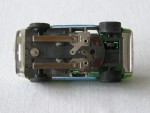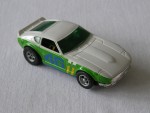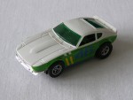 grünliche, nicht durchsichtige Scheiben, ohne Interieur. Karosserie, die an einen verbreiterten Datsun 240 Z, als Rennfahrzeug des John-Morton-BRE-Teams, erinnert, für die H-0 Slot-Rennbahn. Mehrfarbige Karosserie mit der legendären, blauen Startnummer 46 auf den Seiten. Silberne 5-Steg-Felgen mit Weichgummi-Reifen |