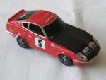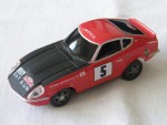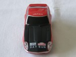 | Massstab | 1:49 |  schwarze, nicht durchsichtige Scheiben und Heckblende. Silberne Stossstangen und Scheibenrahmen. Einem Rallyfahrzeug der Monte-Carlo Rally nachpfunden. Auf der mattschwarzen Motorhaube ein weisser Aufdruck "Datsun" und rot-weisser Aufruck "Monte-Carlo-Rally". Auf den Seiten die schwarz-weisse Startnummer 5 sowie den weissen Aufdruck "Nissan Motorsport Ltd.". Auf dem  Dach den weissen Aufdruck "Japan". Fernsteuerfahrzeug mit 45 MHZ Konfiguration. Kolorierten Lichter mit Glasabdeckungen auf den Scheinwerfern. Original-Raddeckel mit Gummi-Reifen und lenkbaren Vorderräder. Fahrzeug aus einer Alu-Dosen-Serie Radi-Can