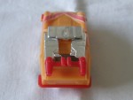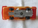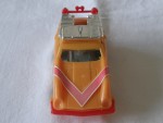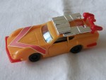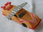durchsichtige Scheiben, ohne Interieur. Rote Stossstangen und Düsenantrieb auf dem Heckdeckel. Einklappbare Chrom-Flügel auf dem Dach. Auf der Motorhaube ein rot-weisser Keil-Aufkleber. Aufzugs-Motor. Schwarze Scheiben-Hartplastikräder. Fahrzeug ist dem Japanischen Manga-Helden "Mach Baro Flight-Z" nachempfunden. Einfaches Kunststoff-Kinderspielzeug |